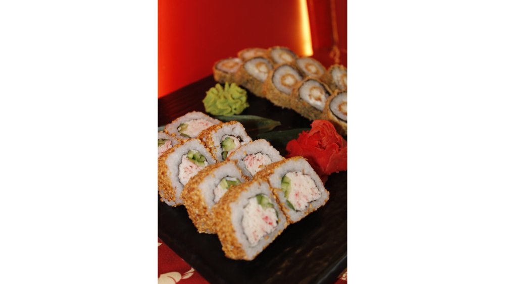 Suşi düyüsü, nori, krem pendiri, xiyar, tempura unu, krevet, qızılbalıq