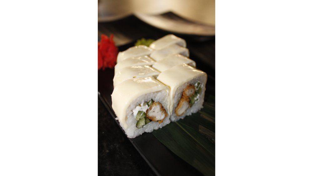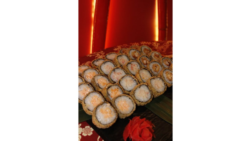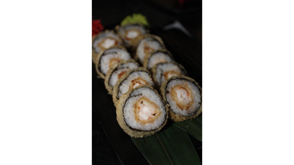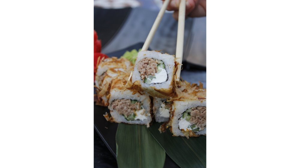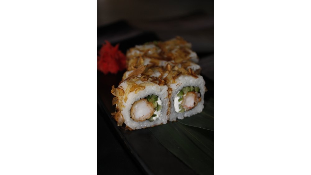 Suşi düyüsü, nori, krem pendiri, tempura unu, krevet, xiyar, tuna çips