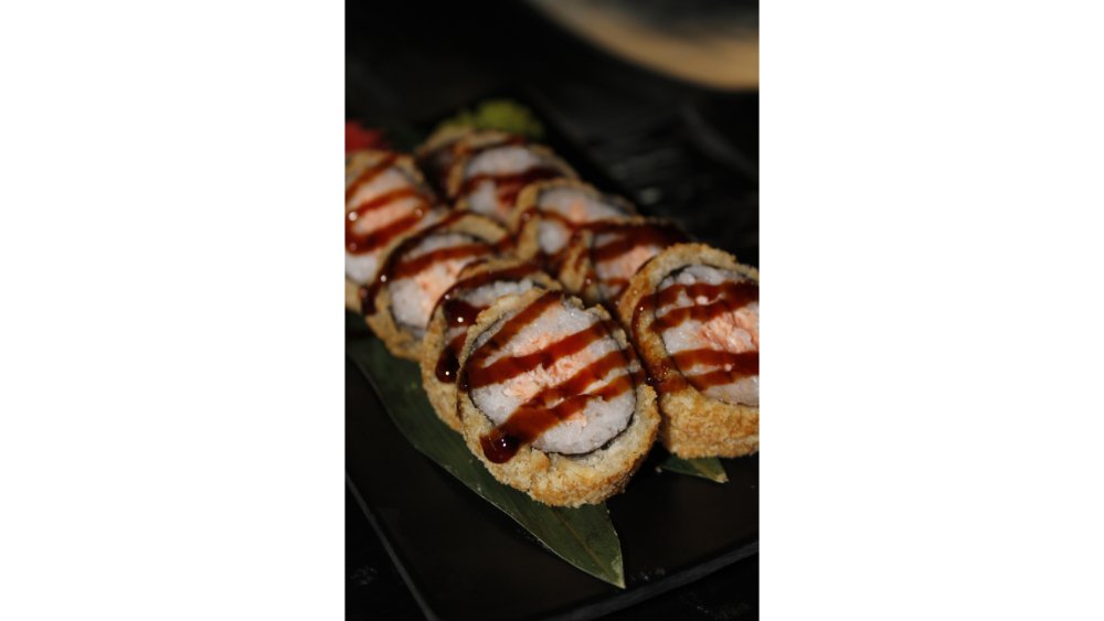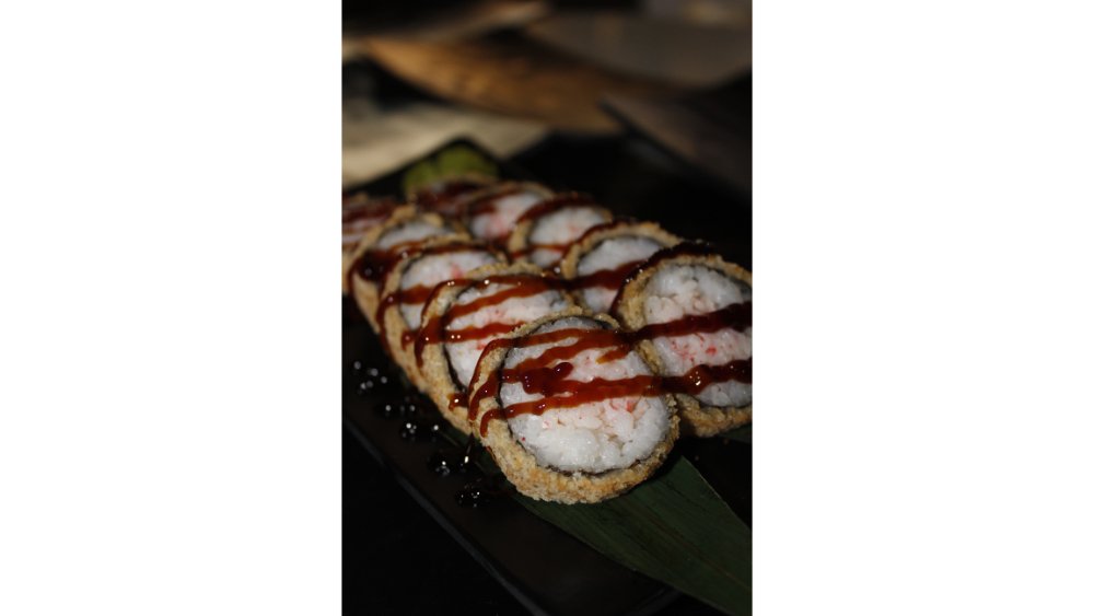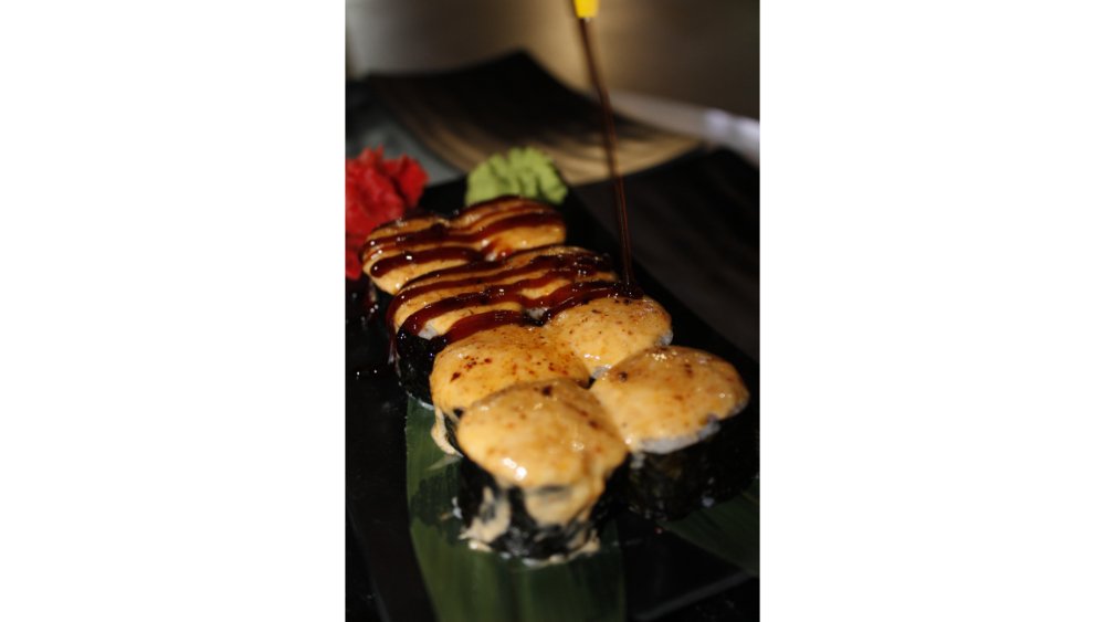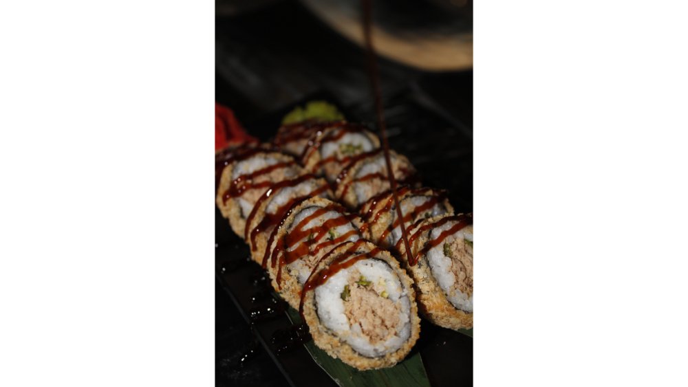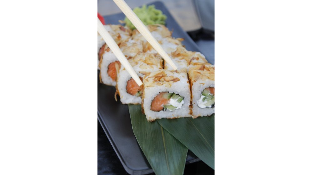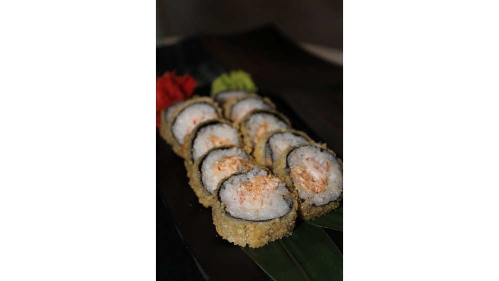 Suşi düyüsü, nori, krem pendiri, tempura unu, krevet, xiyar, tuna çips