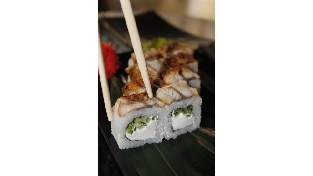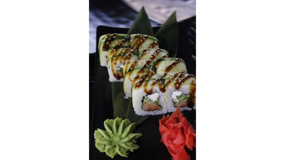 Suşi düyüsü, nori, krem pendiri, xiyar, ilan balığı, küncüt, teriyaki sousu