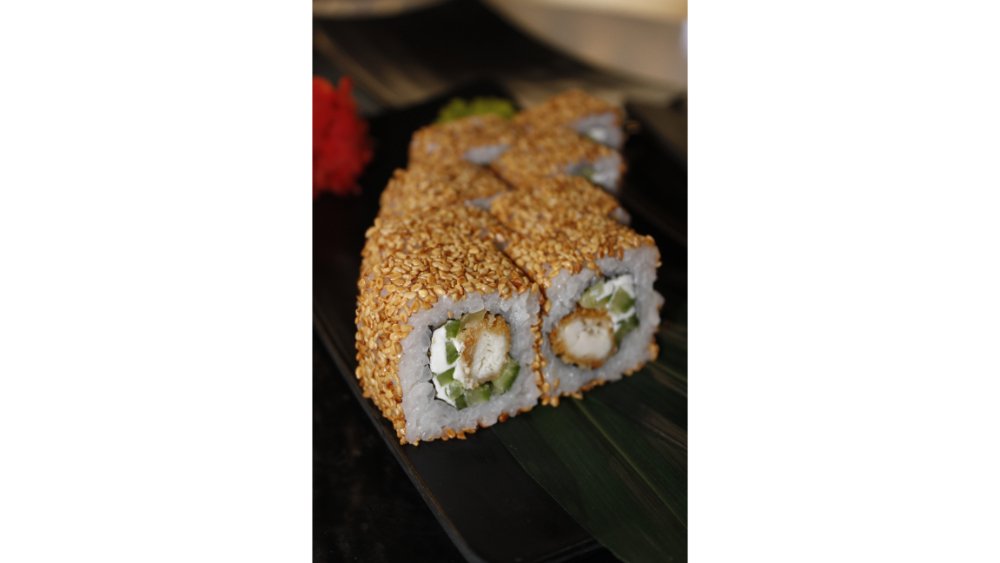 Suşi düyüsü, nori, krem pendiri, tempura unu, krevet, xiyar, tobiko