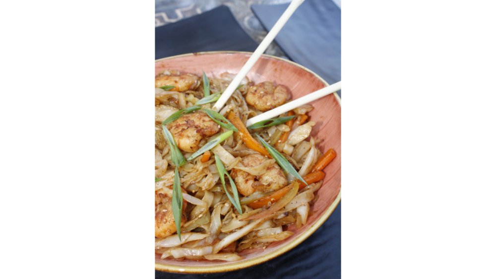 Udon, krevet, ağ kələm, qırmızı kələm, yaşıl bibər, kök, xiyar, oyster sousu, şirin çili sousu, teriyaki sousu, soya sousu, sriraça sousu