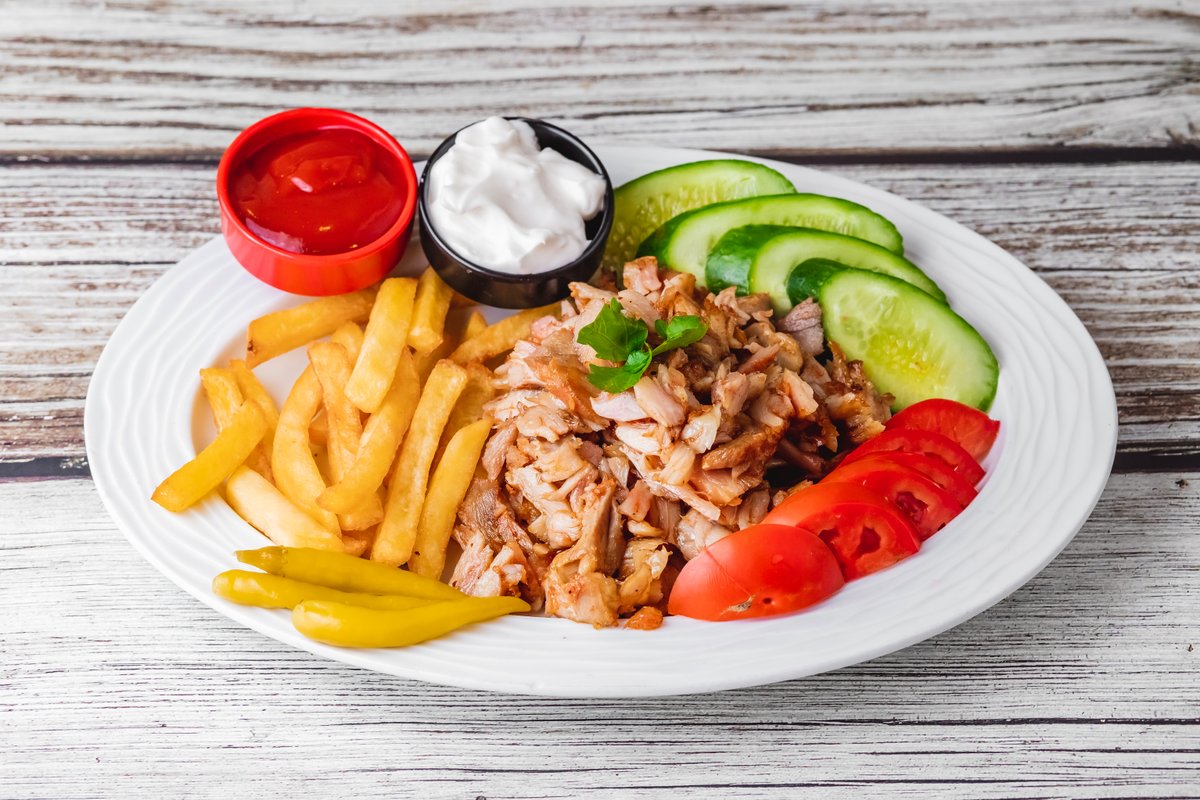 Toyuq ətindən şaurma, pomidor, kahı, xiyar turşusu, kartof fri, sous, lavaş