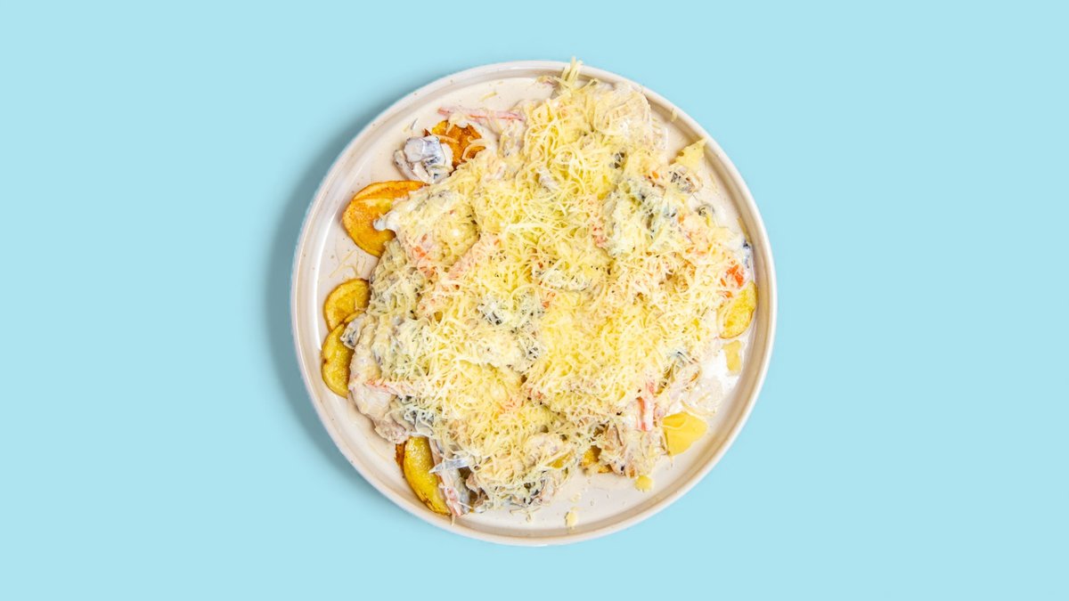 свински врат ввърху канапе от пържени картофи, кисели краставици, гъби, зеленчуци, кашкавал, готварска сметана 500г
