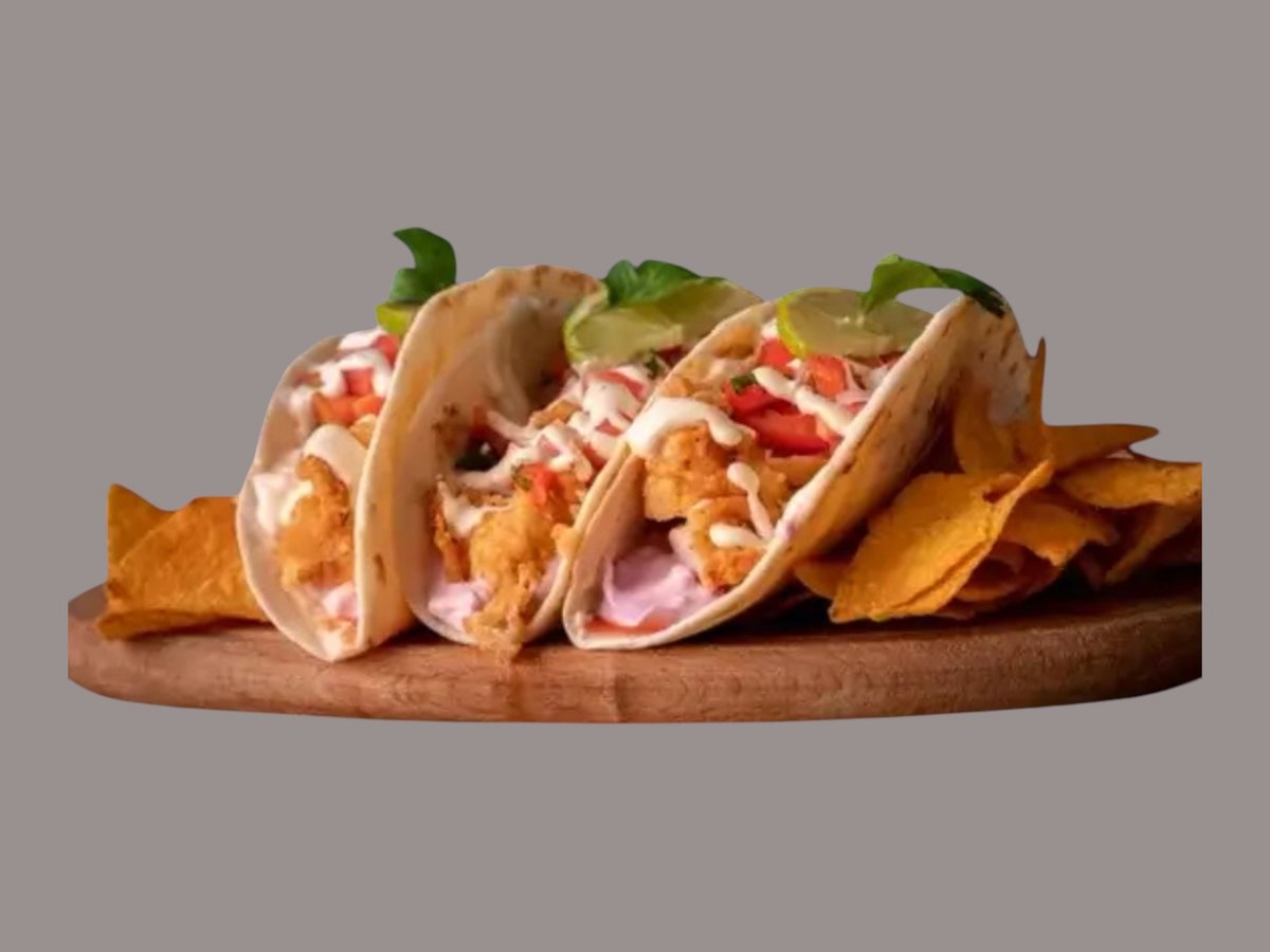 Питка за такос, прясно пилешко филе, салата колсло, салса, сос, лайм, тортила чипс