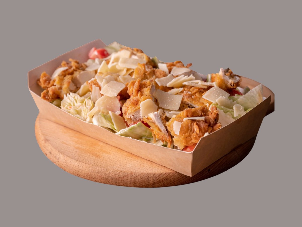 Домат, айсберг, прясно пилешко филе с домашна панировка, пармезан, крутони, сос Цезар