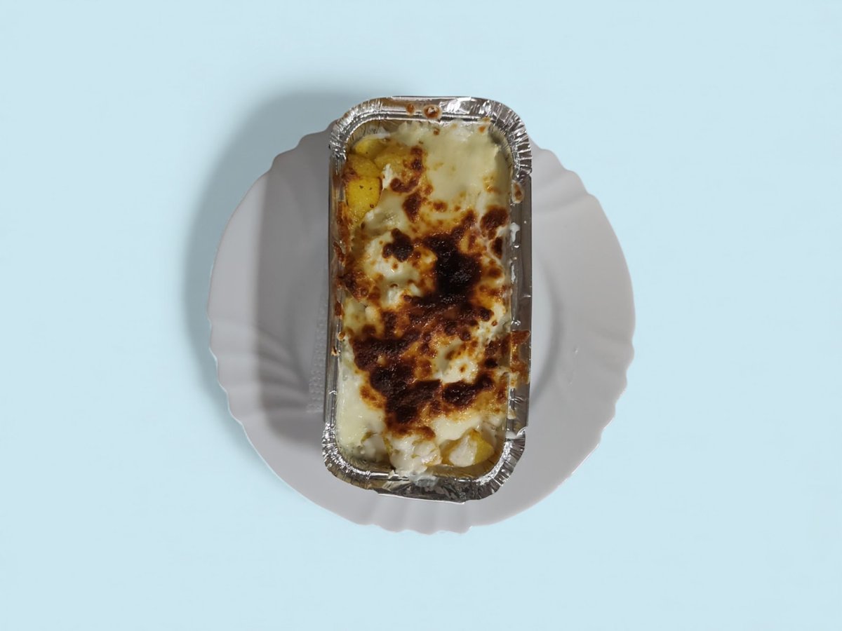 задушени и запечени картофи със сирене, домат, сметана, кашкавал, масло, луканка 350г
