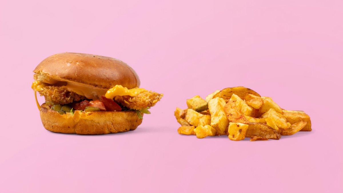 бургер питка, пилешко филе, Чедър сирене, домат айсберг кисела краставичка, бургер сос 400г