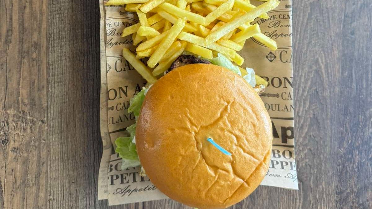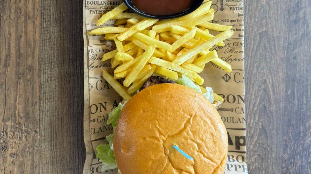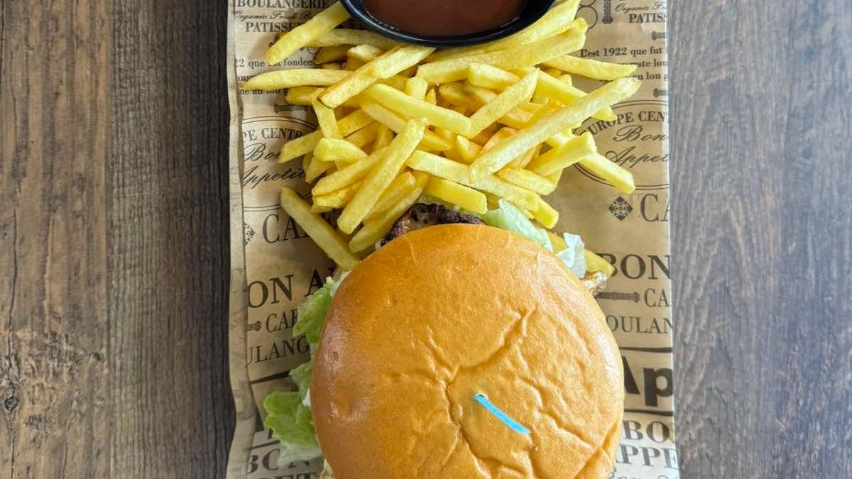 телешки бургер, айсберг, кисели краставички, чедър, бекон, червен лук, пресен домат, салатен крем, пържени картофи сервирани с кетчуп.