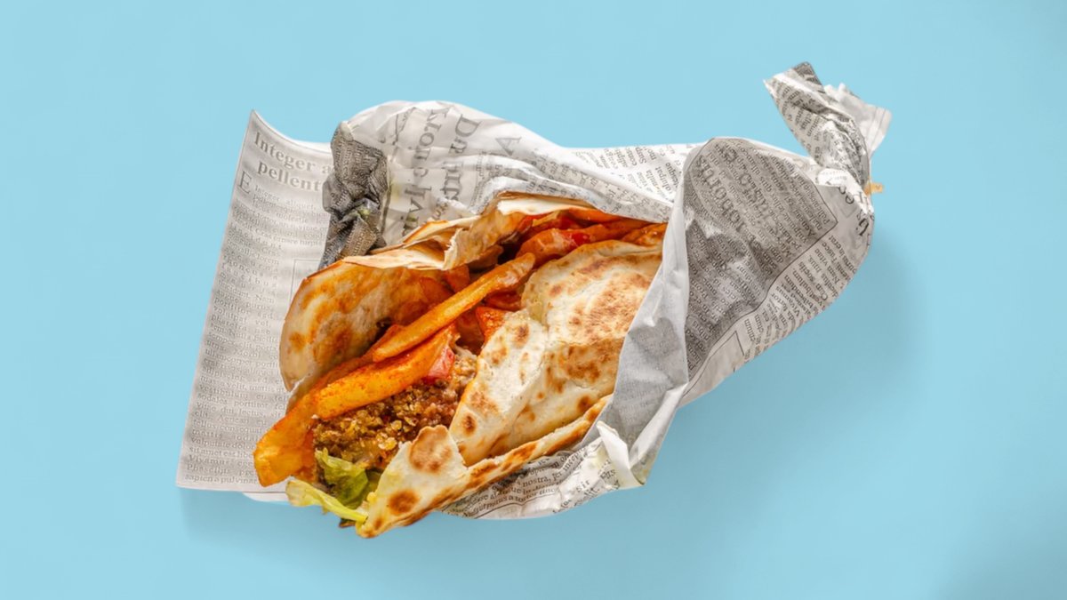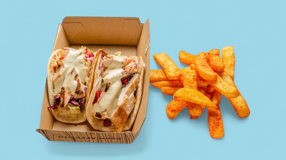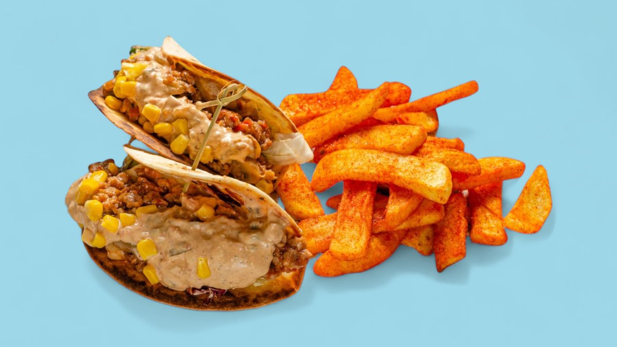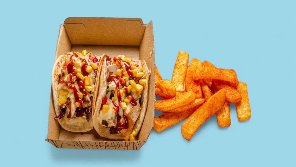 тортила, пилешко, розов домат, микс салати, пържени картофи и тако сос + пържени картофи