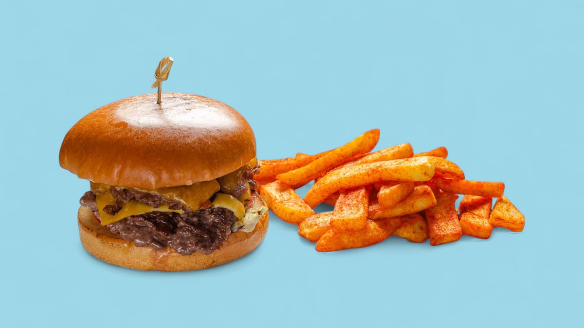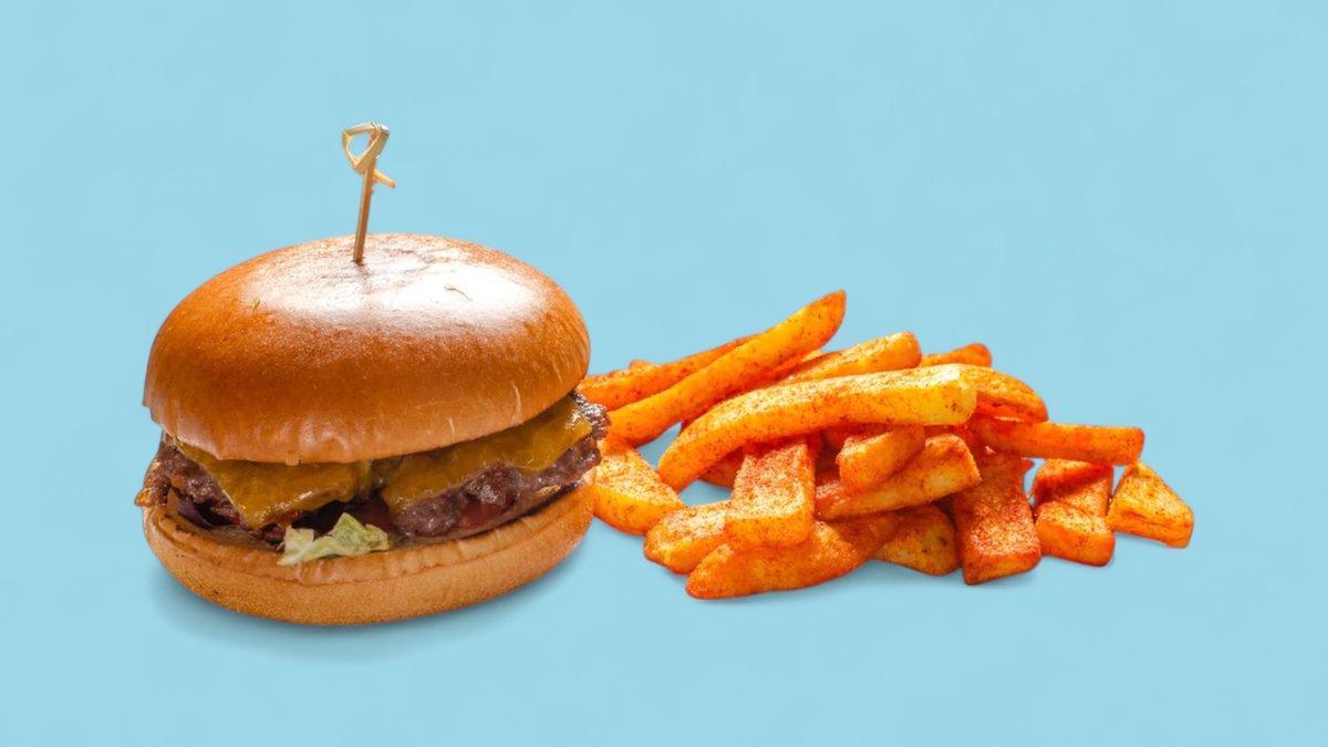 Питка бриош, 2х телешко,2х чедър, домат, микс салати и пържени картофи