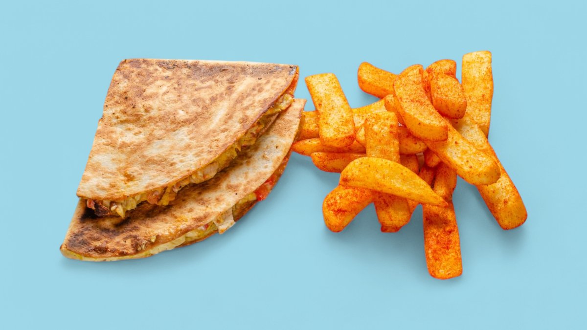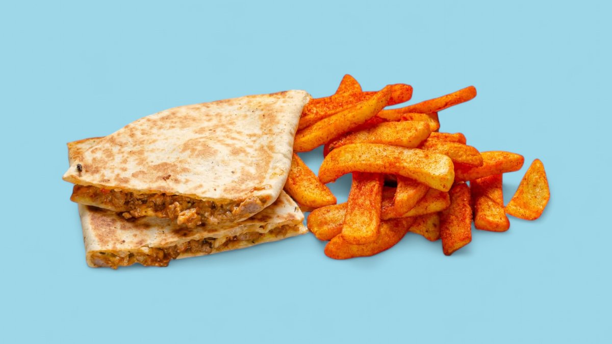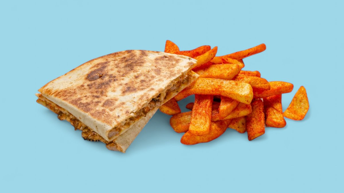 тортила, крема сирене, пилешко филе, моцарела, домат тако сос и тартар coс + пържени картофи