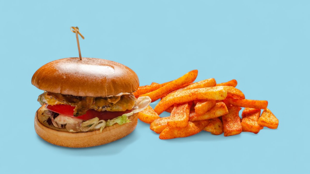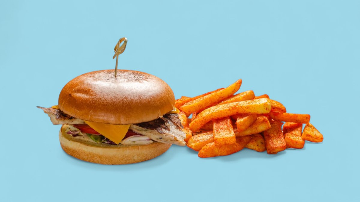 питка Бриош, пилешко филе, Чедър, микс салати домат, два вида сос и пържени картофки
