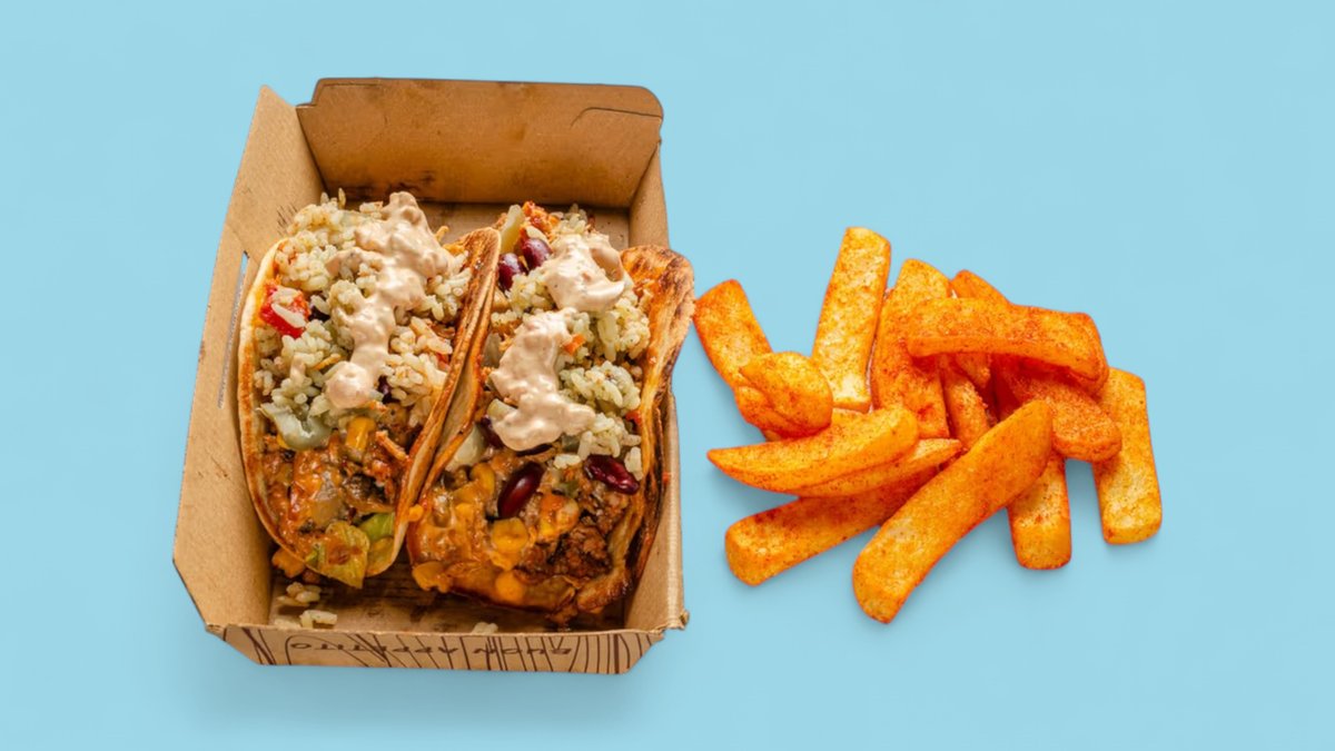 тортила, мляно телешко, басмати, червен боб, царевица, халапеньос и тако сос + пържени картофи