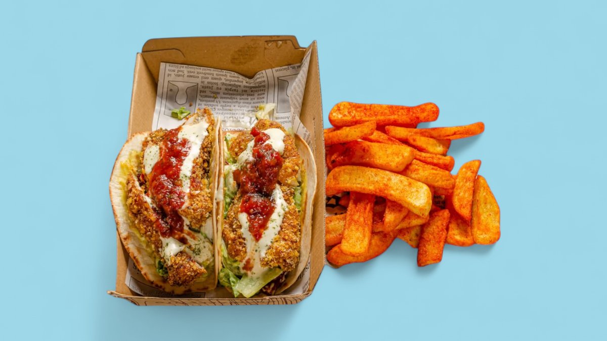 тортила, хрупкво пиле, розов домат, микс салати и тако сос + пържени картофи