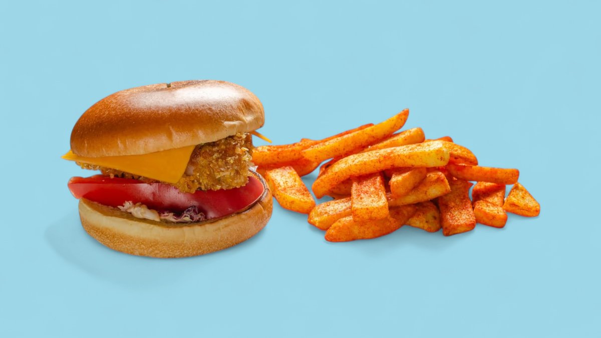 питка бриош, хрупкаво пиле, микс салати, домат, чедър, два вида сос и пържени картофки