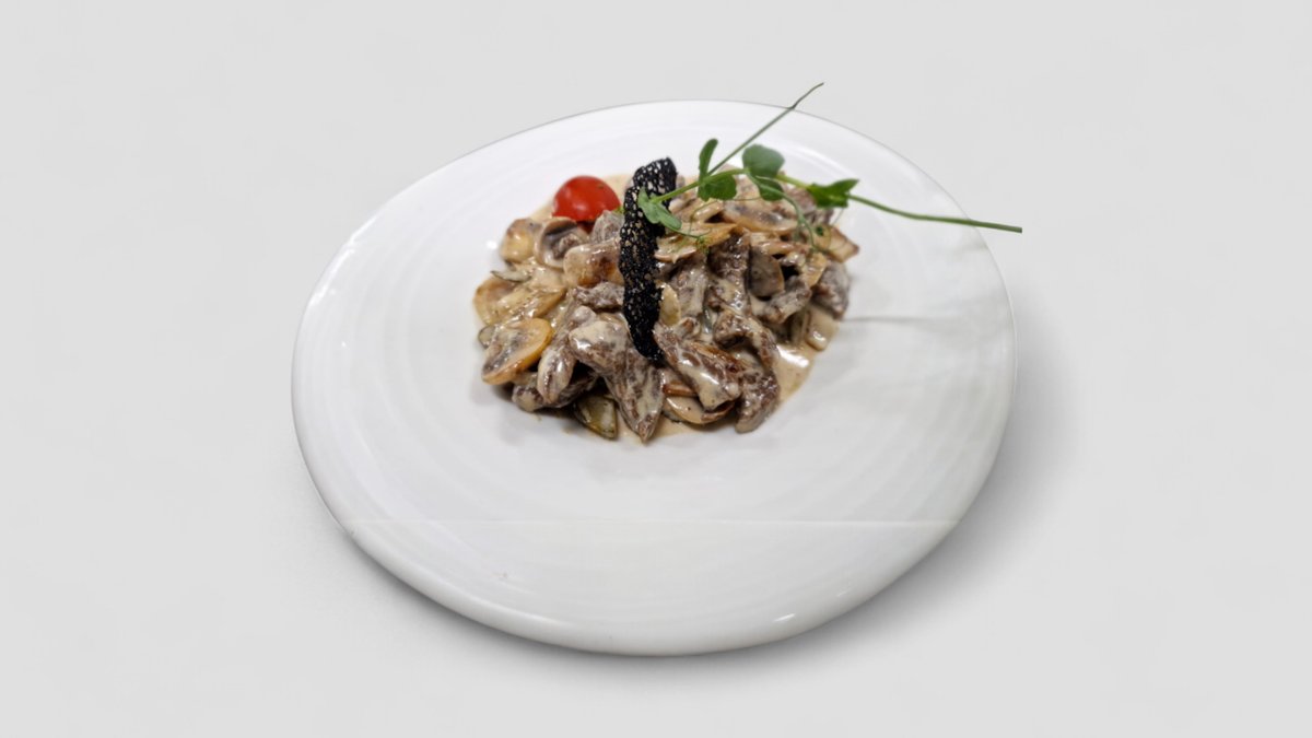 телешки късчета със сметана, лук, гъба и кисела краставица 350гр