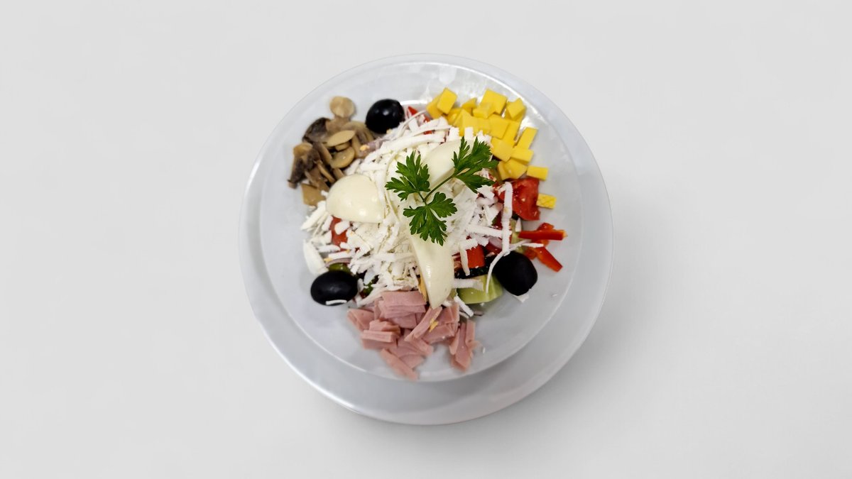 краставици, домати, лук, чушка, краве сирене, варено яйце, мариновани гъби, шунка, кашкавал 400гр