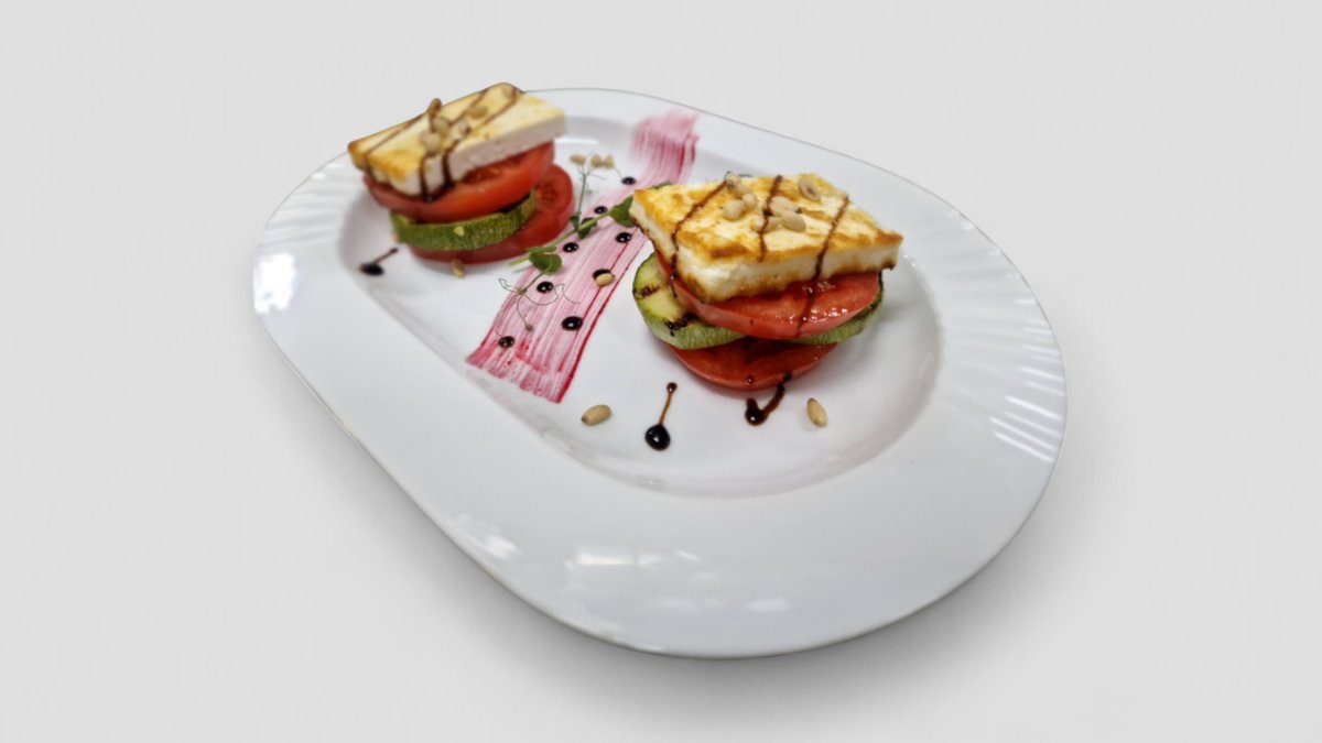 розов домат, грилована тиквичка, запечено краве сирене, кедрови ядки, балсамова редукция 300гр