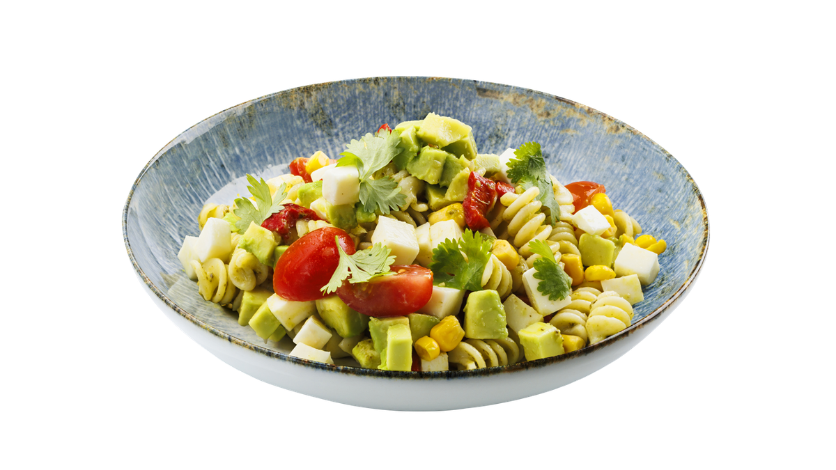 Салата от паста с фузили, чери домати, авокадо, прясна биволска моцарела, царевица, босилково песто и кориандър - 300г