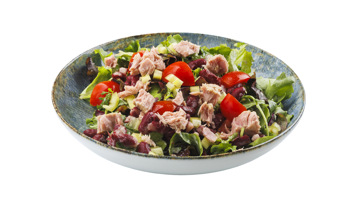 Микс от свежи салати с риба тон, краставици, червен боб, зелени чушки, чери домати, червен лук, и горчичен дресинг - 300г