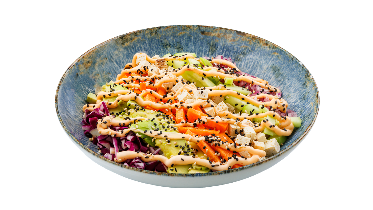 Поке бол с басмати ориз, пушено тофу, авокаде, червено зеле, свежа краставица, червен лук и пикантна майонеза - 400г