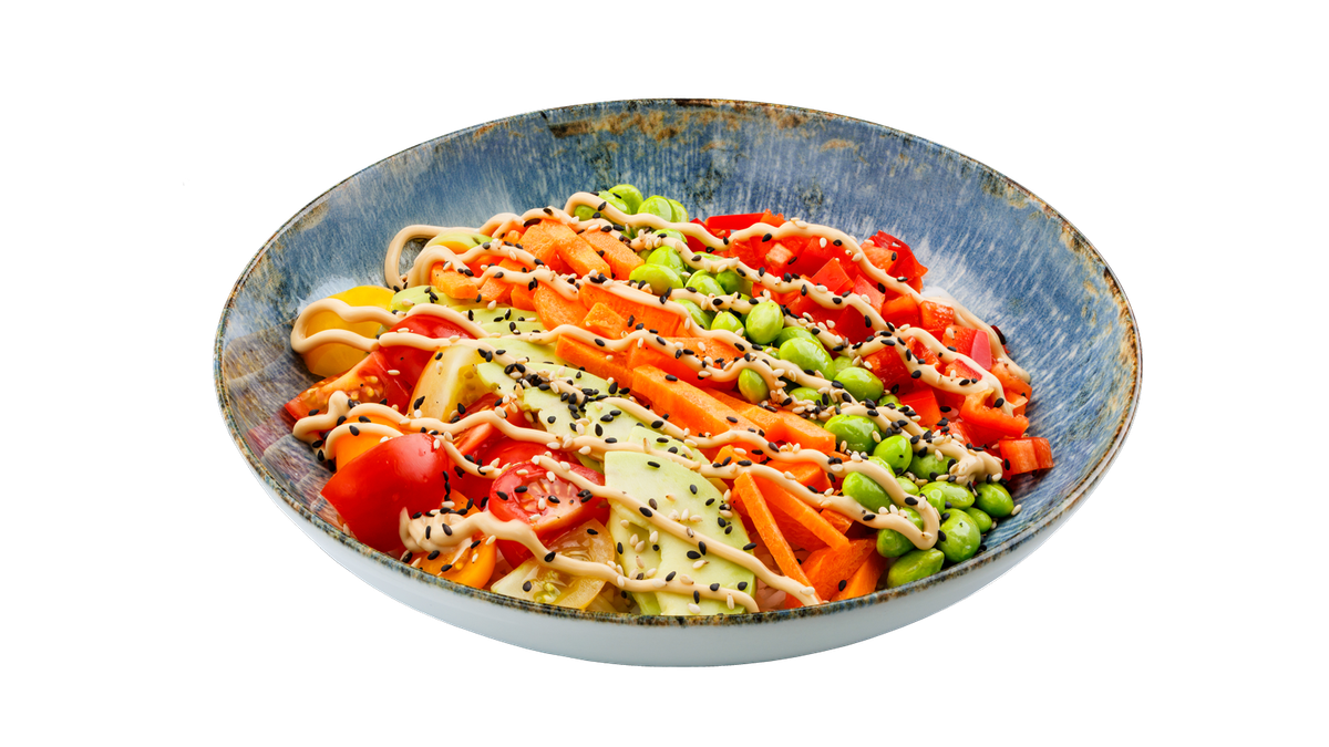 Поке бол с басмати ориз, авокадо, моркови, цветни чери домати, червени чушки и унаги майонеза - 380г