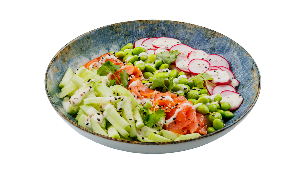 Поке бол с басмати ориз, пушена сьомга, едамаме, репички, краставици, горчичен сос и свеж кориандър - 340г