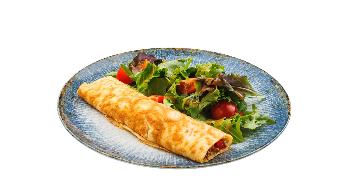 Омлет с фермерско сирене, печурки, бейби спанак и свежа салата от рукола и цветни чери домати - 300г