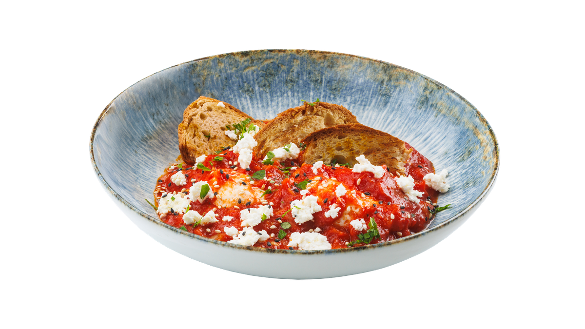 Шакшука с яйца, чушки, доматен сос, сладко чили, фермерско сирене и безглутенов хляб - 350г