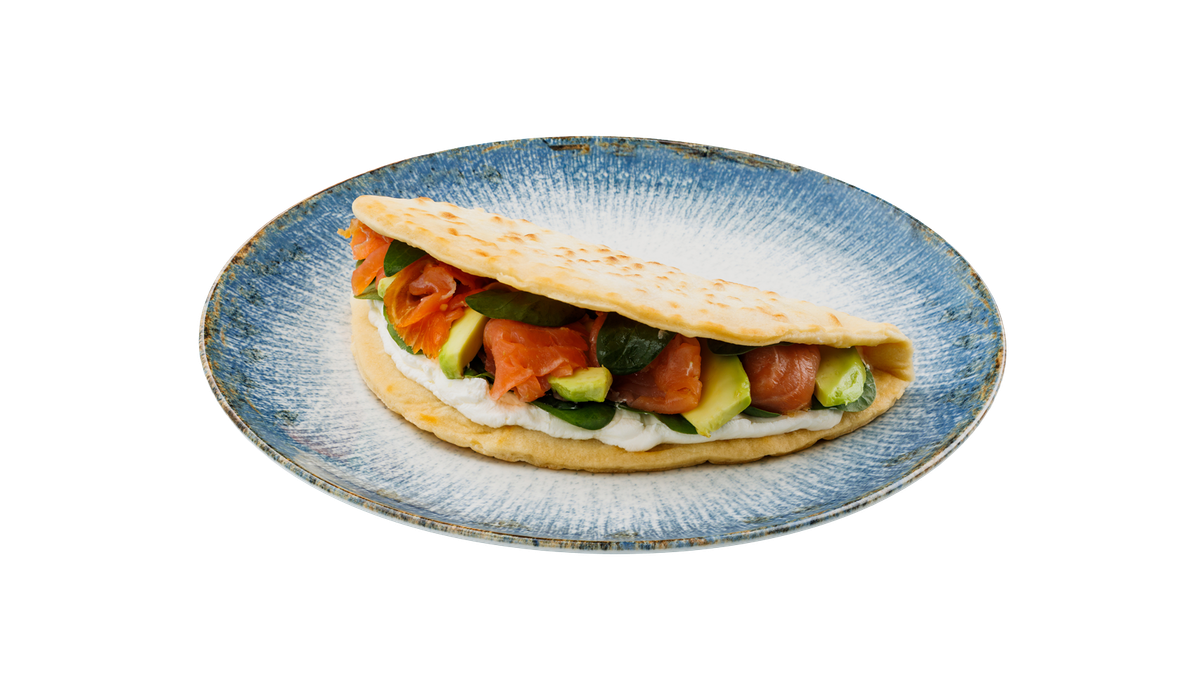Пиадина с пушена сьомга, авокадо, крема сирене, бейби спанак, свежи салатки и медено горчичен сос - 280г
