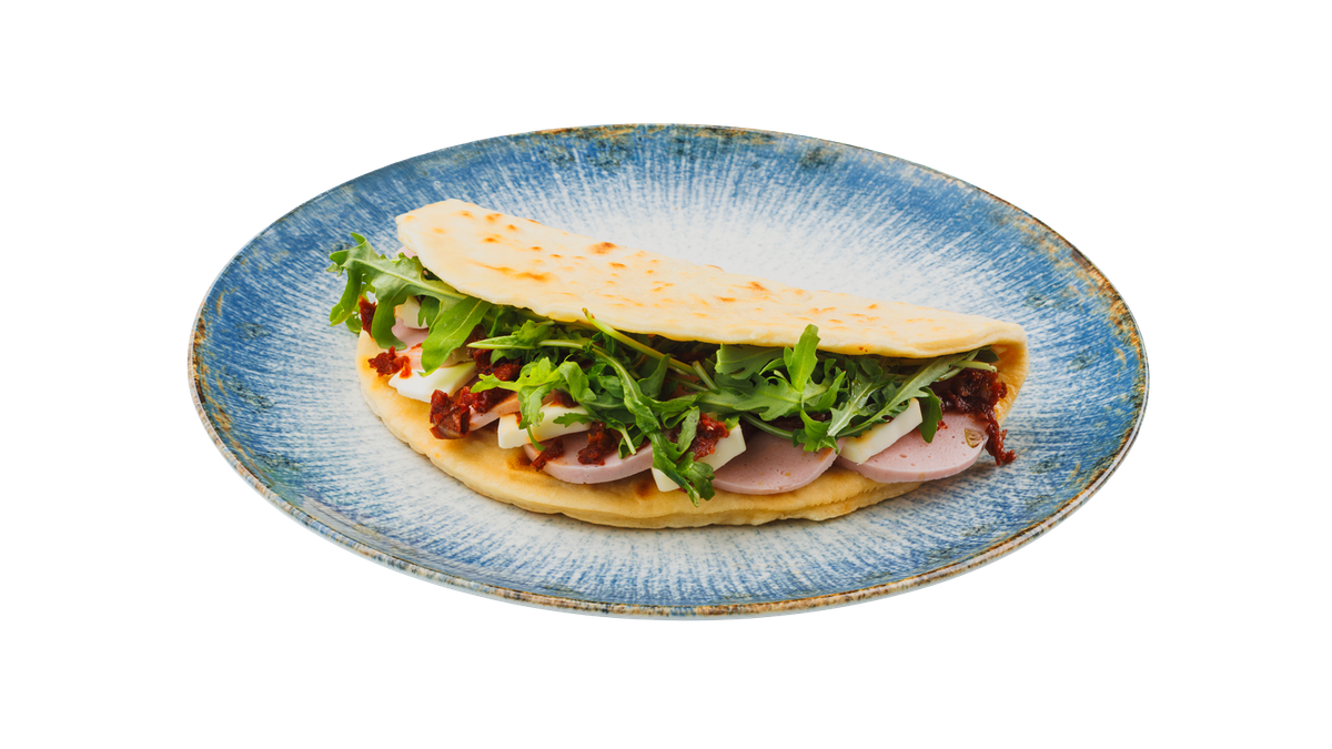 Пиадина с веган мортадела, моцарела, сушени домати, песто и свежа салата - 280г