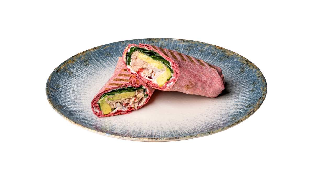 Рап с веган риба тон, червен лук, веган крема сирене, авокадо, бейби спанак и горчичен сос - 250г