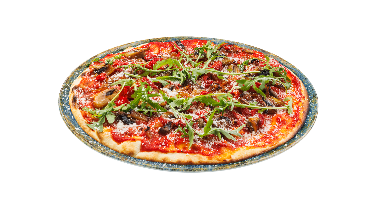 Веган пица с млени домати, печурки, карамелизиран лук, червени печени чушки, свежа рукола и веган пармезан - 400г
