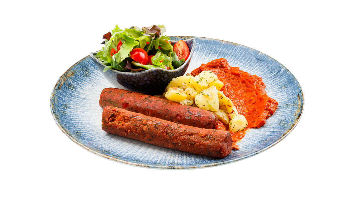 Веган кебапчета с пресни чеснови картофки с масло и едросмляна лютеница - 380г