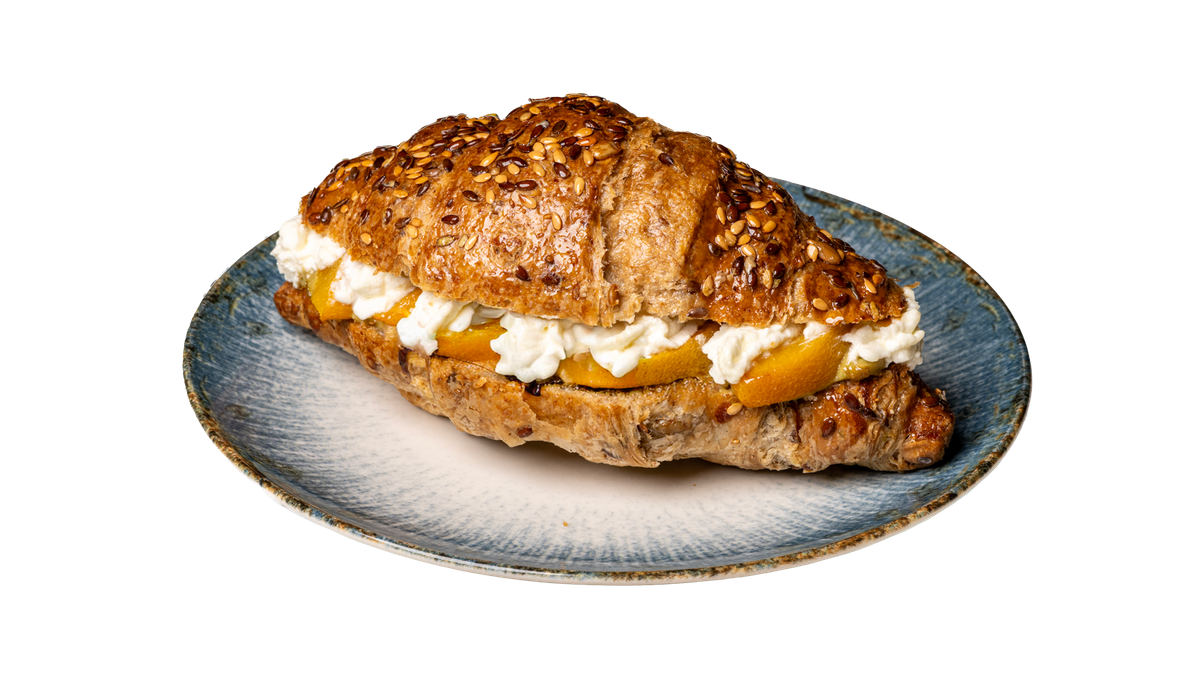 Пълнозърнест кроасан със семена, карамелезирани праскови, крема сирене и кленов сироп - 120г