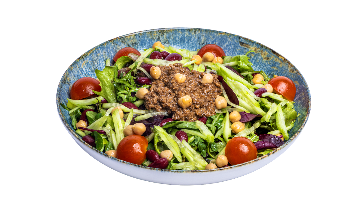 Микс от свежи салати с веган риба тон, краставици, червен боб, зелени чушки, чери домати, червен лук, и горчичен дресинг - 300г