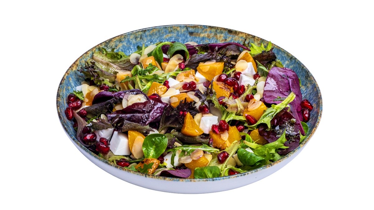 Микс от свежи салати с карамелизирани праскови, веган сирене, филиран бадем, кленов сироп и нар - 200г