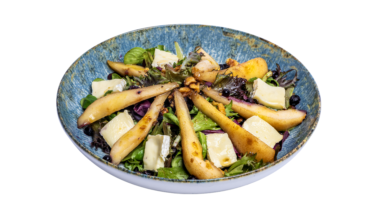 Микс от свежи салати с пресни круши, карамелизирани боровинки, сирене Бри, орехи и портокалов дресинг - 230г