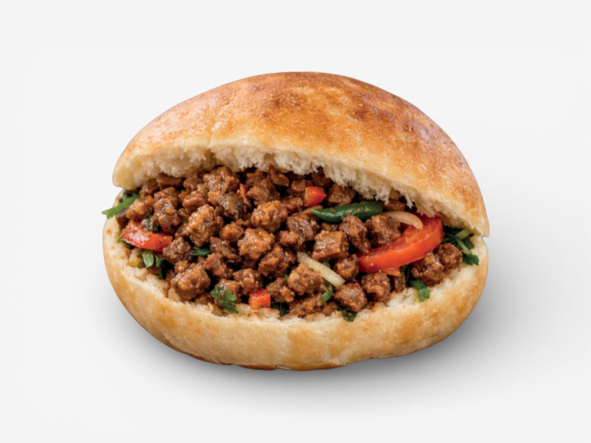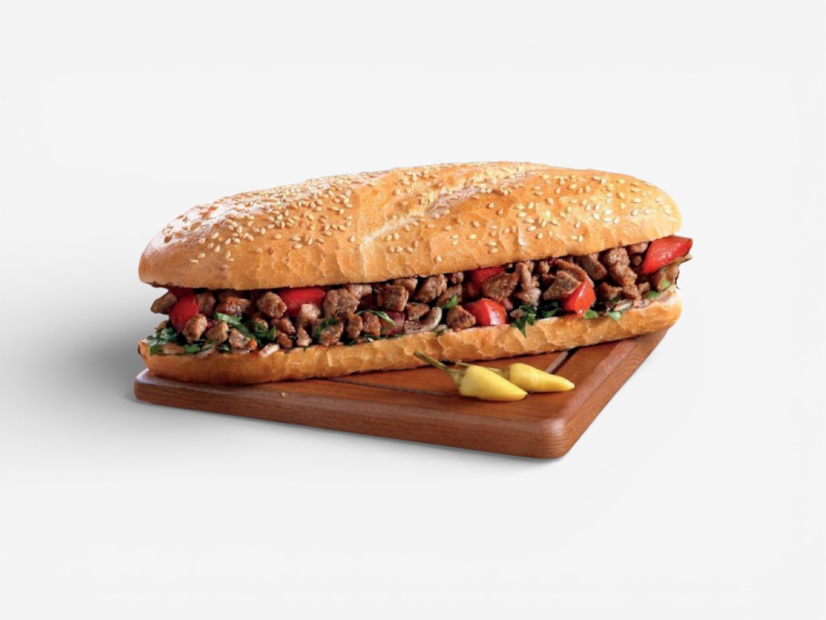 Традиционен шедьовър! 200г крехко телешко на уок с памуково масло, поднесено в 300г пресен сомун със свеж микс от магданоз, сумак и лук