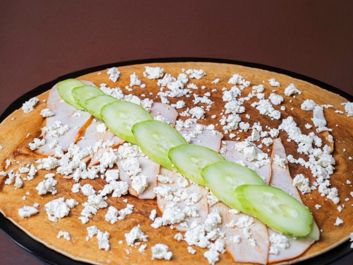 пълнозърнеста солена палачинка с пилешко филе, бяло сирене и пресни краставички