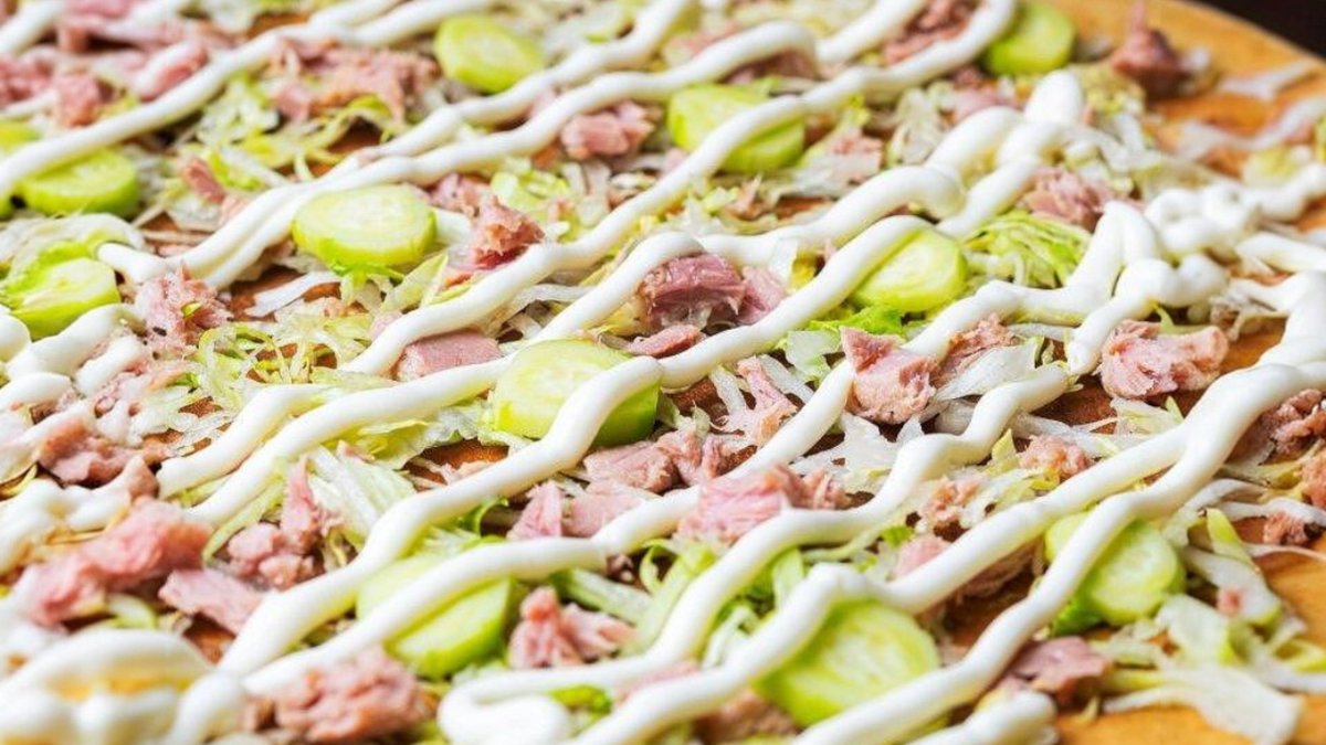 пълнозърнеста солена палачинка с риба тон, пресни краставички, салата айсберг и лека майонеза