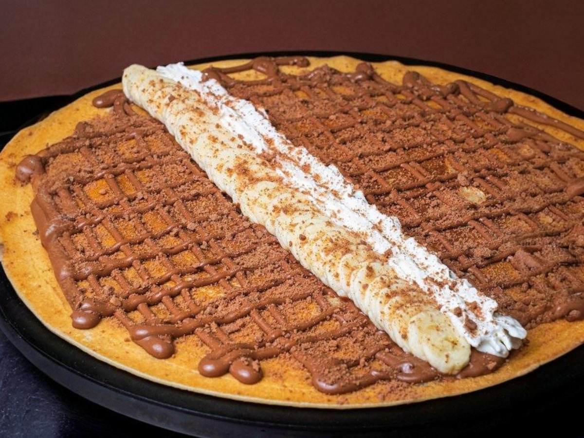 сладка палачинка с шоколад, резенчета банан, смлени бисквитки и бита сметана