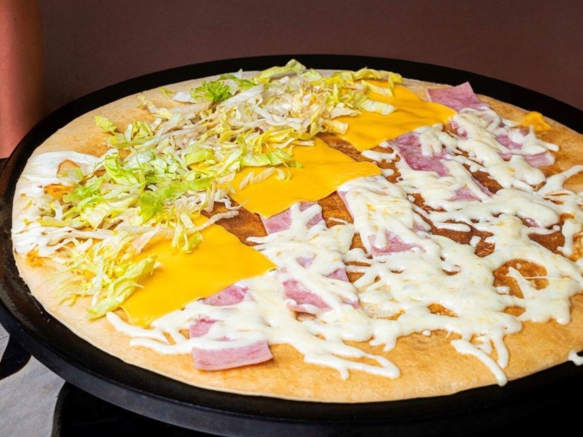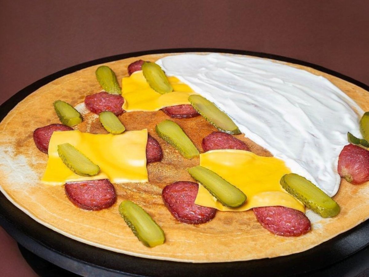 Палачинка с луканка, топено сирене, чедър и кисели краставички