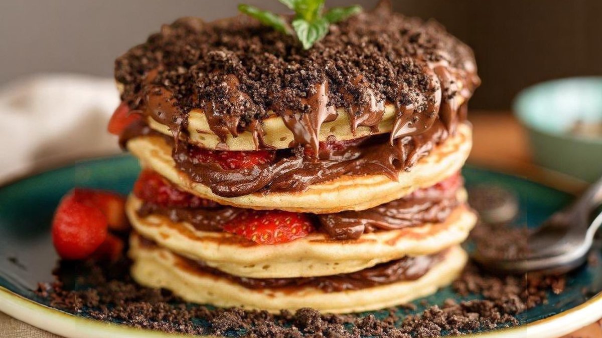 4 броя сладки американски палачинки, обилно поляти с Nutella, аранжирани с резенчета ягоди и покрити с бисквити Oreo 290г