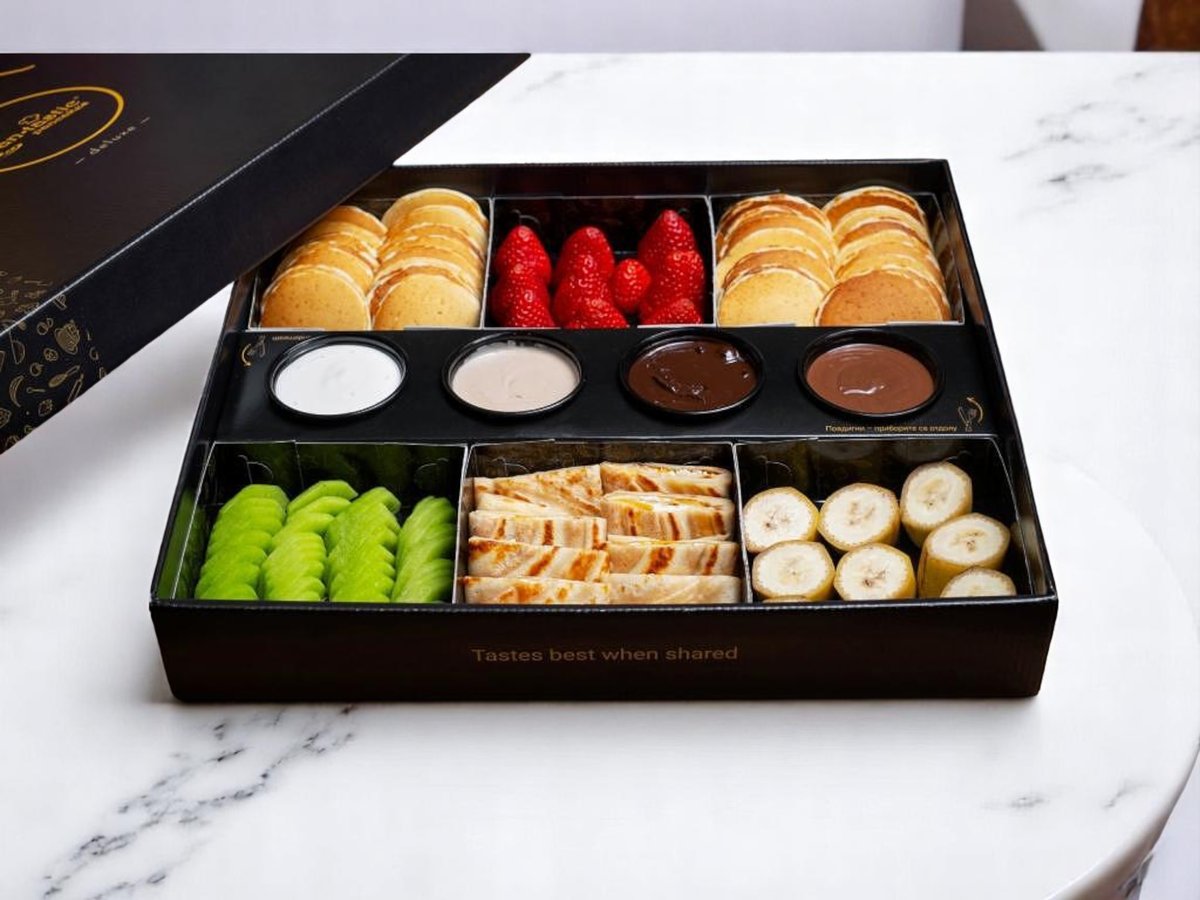 изискан бокс сет за незабравими сладки моменти-20 мини палачинки, ягоди, банан и киви с комплимент от 3 добавки по избор. 1000 г