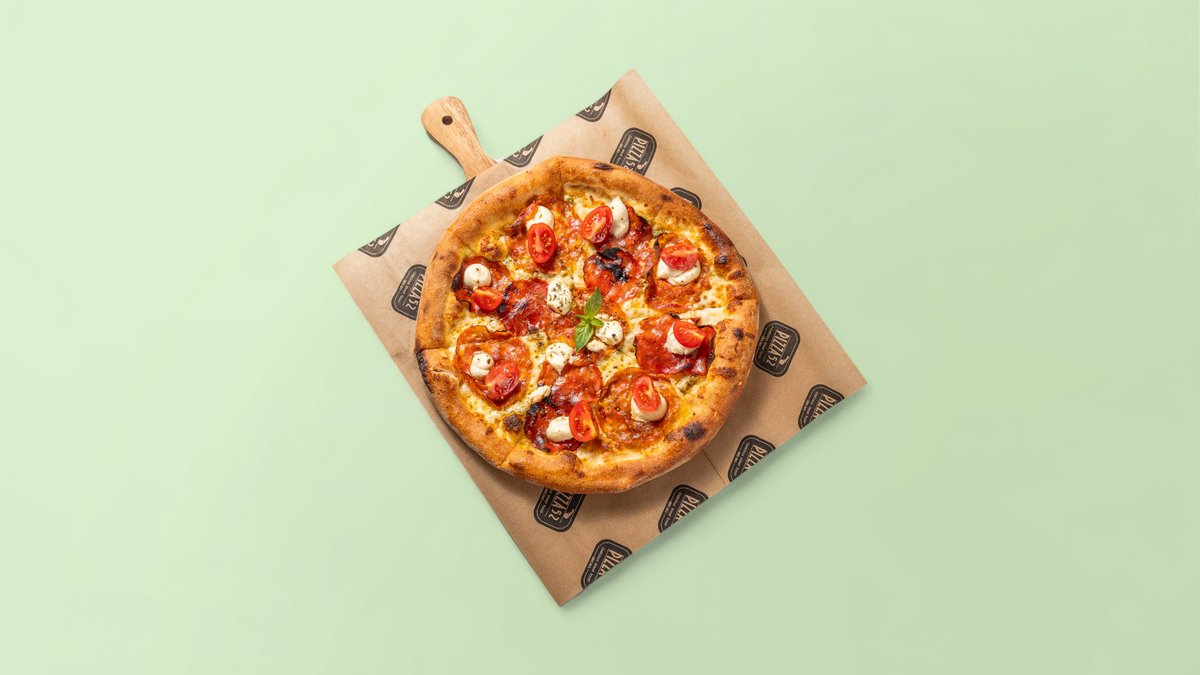доматен сос, моцарела, ементал, топ сирене, филаделфия, чери домати, риган и зехтин 400г