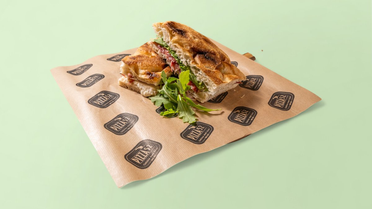 хляб, зехтин, прошуто крудо, сирене страчатела, домати, рукола 400г