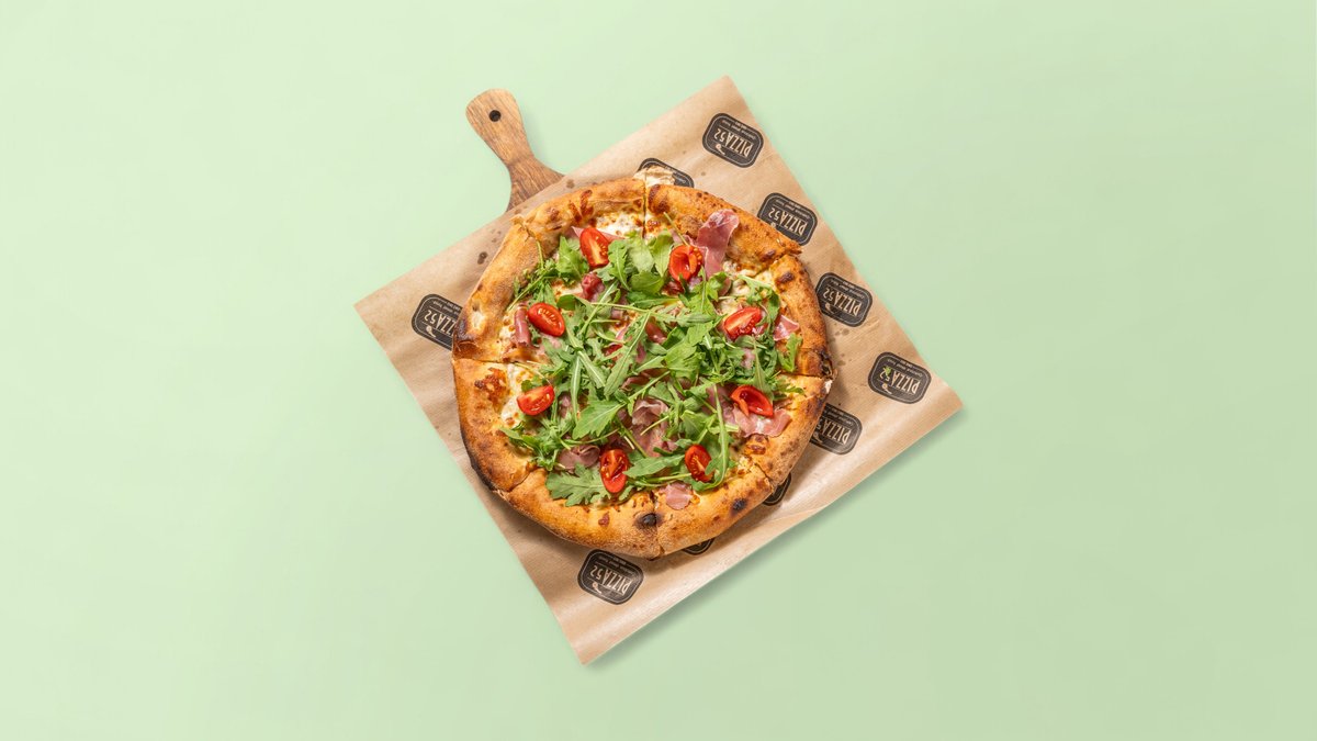 трюфел сос, моцарела, прошуто кредо, рукола чери домати, риган и зехтин 400г