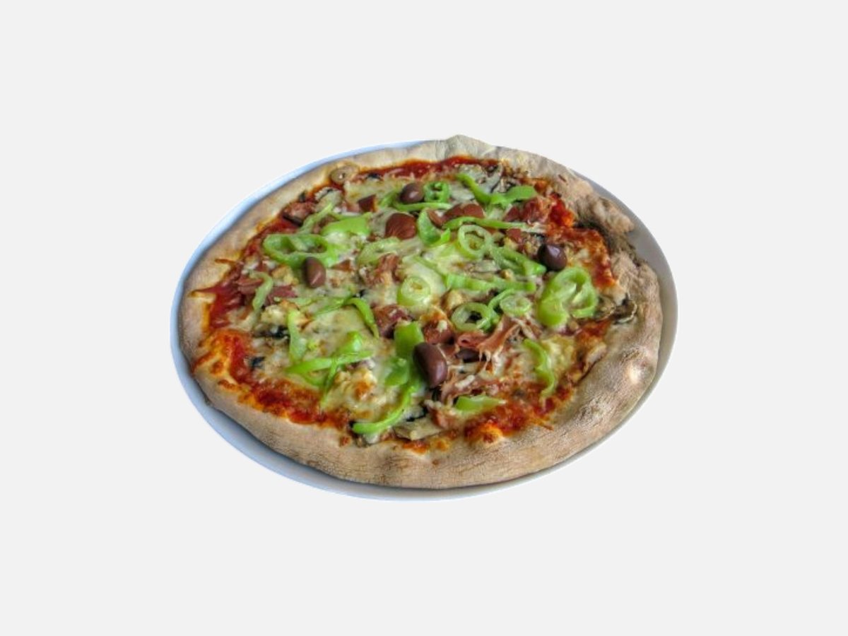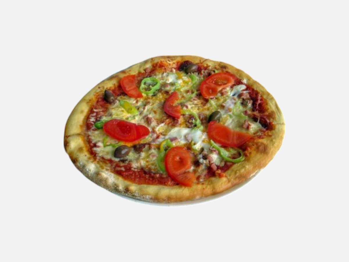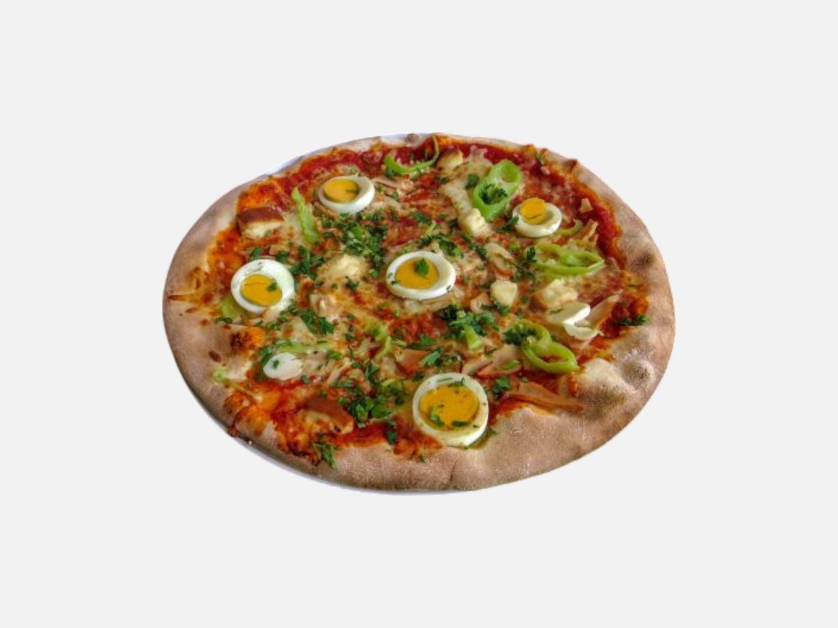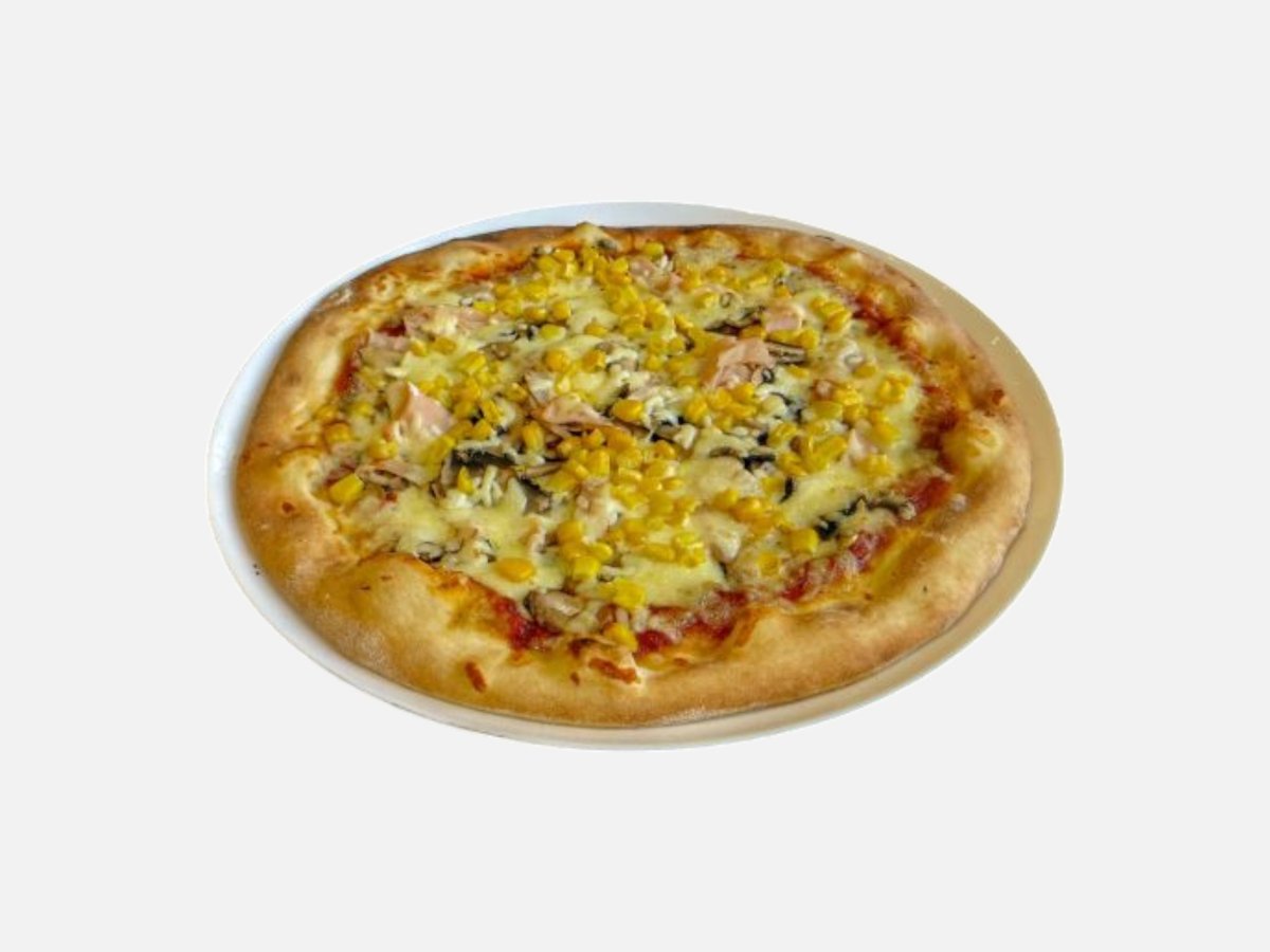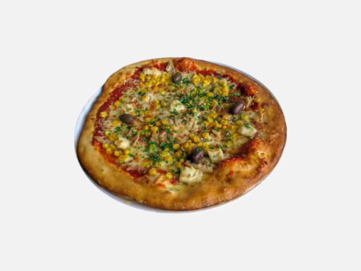 доматен сос, кашкавал, пилешко филе, царевица, топено сирене, маслини, чеснов сос, магданоз 480 г